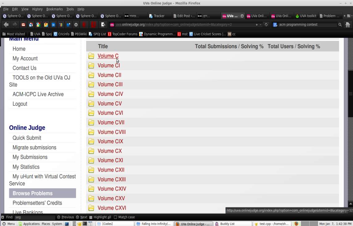 অ্যাকাউন্ট খুলে তুমি বামে browse problems থেকে “Contest Volumes” লিংকটাতে যাও। সেখানে দেখবে উপরের মতো volume C,volume CI ইত্যাদি লেখা আছে। তুমি volume C তে ক্লিক করো। সেখানে দেখবে প্রবলেমের একটা লিস্ট এসে গিয়েছে।