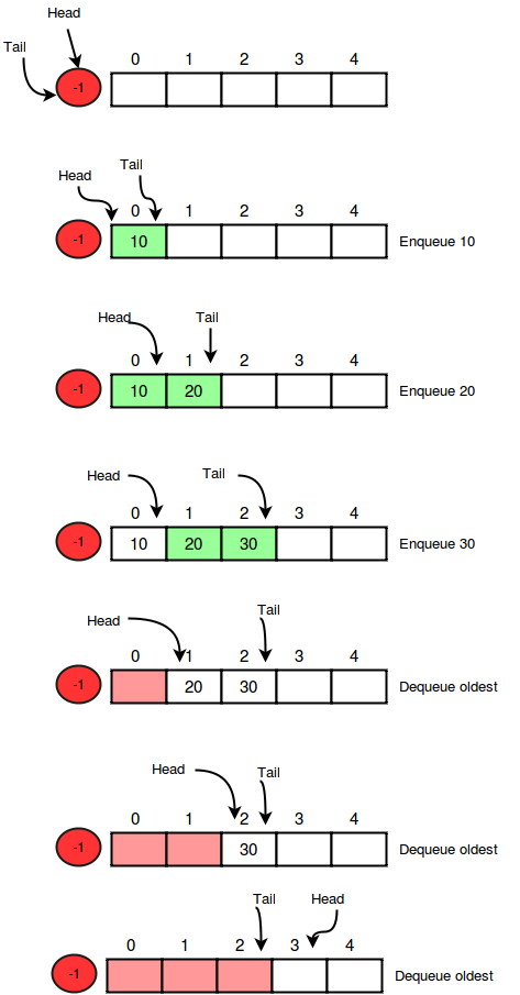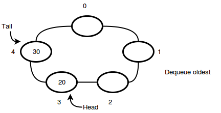 এখন যদি আরো একটা নতুন এলিমেন্ট এনকিউ করতে চাও তাহলে তোমার প্রয়োজনের উপর ডিপেন্ড করে দুইরকম ঘটনা ঘটতে পারে। এনকিউ ফাংশন এরোর দিতে পারে যে জায়গা খালি নেই। অথবা সবথেকে পুরানো এলিমেন্টটা ফেলে দিয়ে সেই জায়গায় নতুন এলিমেন্টটা রাখতে পারো, এটাকে বলা হয় সার্কুলার বাফার।