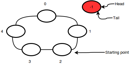 লক্ষ কর, শেষের এলিমেন্টটা ডিকিউ করার পর হেড টেইলের এর সামনে চলে গেছে। এতে কোনো সমস্যা নাই, Head > Tail বা Head = -1 মানে হলো কিউটা পুরোপুরি খালি।