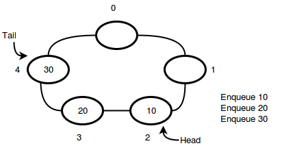 সার্কুলার কিউতে তুমি শুরুতে যেকোনো পজিশনে এনকিউ করতে পারো, উদাহরণ হিসাবে ছবিতে 2 নম্বর ইনডেক্সকে স্টার্টিং পয়েন্ট ধরেছি। আগের মতোই কিউ 10, 20 এবং 30 এনকিউ করার পর দেখতে হবে এরকম: