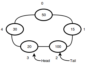 এখন যদি আরো একটা নতুন এলিমেন্ট এনকিউ করতে চাও তাহলে তোমার প্রয়োজনের উপর ডিপেন্ড করে দুইরকম ঘটনা ঘটতে পারে। এনকিউ ফাংশন এরোর দিতে পারে যে জায়গা খালি নেই। অথবা সবথেকে পুরানো এলিমেন্টটা ফেলে দিয়ে সেই জায়গায় নতুন এলিমেন্টটা রাখতে পারো, এটাকে বলা হয় সার্কুলার বাফার