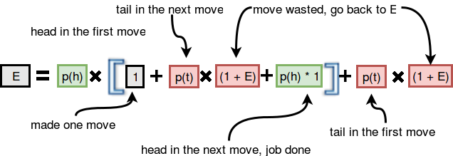 মনে করো $E$ বার টস করলে তুমি পরপর দুইটি হেড পাবে। এখন তুমি যদি প্রথমবার টেইল পাও তাহলে একটা টস নষ্ট হবে এবং তোমাকে গড়ে আরো $p(t) \cdot (1+E)$ বার টস করতে হবে। কিন্তু তুমি যদি প্রথমবার হেড পাও তাহলে দুটি ঘটনা ঘটতে পারে, পরের বার তুমি টেইল পাবে এবং আরো $p(t) \cdot (1+E)$ বার টস করতে হবে, অথবা পরেরবার তুমি আরেকটা হেড পাবে এবং আর টস করা দরকার নেই। সবগুলো ঘটনা একসাথে করলে এক্সপেক্টেড ভ্যালু হবে $E=p(h) \cdot (1+ p(t) \cdot (1+E) + p(h) \cdot 1) + p(t) \cdot (1+E)$। নিচের ছবিতে আবারো ব্যাখ্যা করা আছে সূত্রটা: