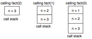 যখন $fact(3)$ থেকে $fact(2)$ কে কল করা হচ্ছে তখন $n = 3$ কে স্ট্যাকে সেভ করে রাখা হচ্ছে। ঠিক সেভাবে $n = 1$ কল করার সময় $n = 2$ কে স্ট্যাকে সেভ করে রাখা হচ্ছে। এভাবে সেভ করে রাখার কারণে রিকার্সিভ কল শেষ করে ফিরে আসার সময় স্ট্যাকের উপরে আগের ফাংশন কলের প্যারামিটার গুলো খুজে পাওয়া যায় সহজেই। (বিস্তারিত জানতে স্ট্যাক নিয়ে আমার এই লেখাটা পড়তে পারো।