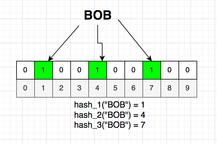 এখন মনে করো প্রথম ইউজারের নাম হলো “BOB”। “BOB” কে 3 টা হ্যাশ ফাংশন দিয়ে হ্যাশ করে আমরা ধরো পেয়েছি 1, 4 এবং 7। আমরা ব্লুম ফিল্টারে সেই বিটগুলোকে অন করে দিবো।