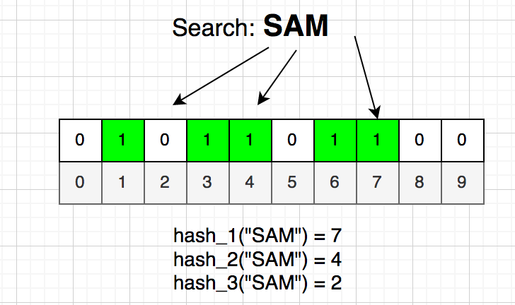 এখন নতুন একটা শব্দ ব্লুম ফিল্টারে আছে নাকি নেই সেটা বুঝতে হলে তোমাকে আগে সেই নামটাকে $k$ বার হ্যাশ করতে হবে এবং $k$ টি পজিশনে গিয়ে দেখতে হবে বিটটি অন আছে নাকি। যদি তুমি অন্তত একটি বিট অফ পাও তার মানে শব্দটি নিশ্চিতভাবেই ব্লুম ফিল্টারে নেই।