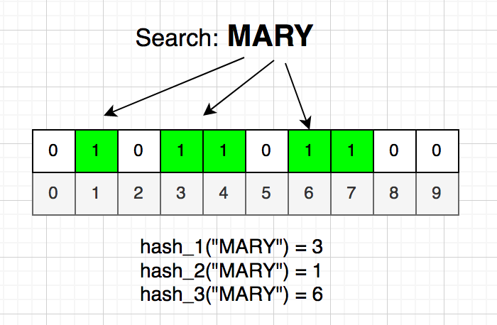 কিন্তু তুমি যদি $k$ টি পজিশনেই বিট অন পাও তাহলে কিন্তু নিশ্চিতভাবে বলতে পারবে না শব্দটি আছে নাকি নেই। যেমন ধরা যাক “MARY” নামটি হ্যাশ করার পর আমরা পেয়েছি 3, 1 এবং 6। এর আগে ALICE থেকে থেকে পেয়েছিলাম {3, 7, 6} আর BOB থেকে {1, 4, 7}। যখন আমরা MARY খুজবো তখন সবগুলো বিটই অন পাবো, কিন্তু শব্দটা আমরা আগে সেভ করিনি।