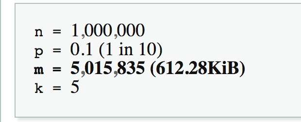 এর মানে আমার যদি ১০ লাখ স্ট্রিং থাকে এবং আমি যদি চাই যে এরোর রেট হবে 0.1% এবং আমি ৫টি হ্যাশ ফাংশন ব্যবহার করবো, তাহলে আমার 612 কিলোবাইট সাইজের ব্লুম ফিল্টার ব্যবহার করতে হবে। দেখতেই পাচ্ছো ব্লুম ফিল্টার খুবই অল্প মেমরি ব্যবহার করে।