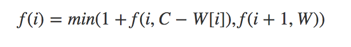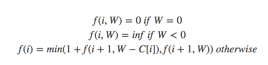 #define MAX_N 20 #define MAX_W 10000 #define INF 99999999 #define EMPTY_VALUE -1 int C[MAX_N]; int mem[MAX_N][MAX_W]; int n; int f(int i, int W) { if (W < 0) return INF; if (i == n) { if (W == 0) return 0; return INF; } if (mem[i][W] != EMPTY_VALUE) { return mem[i][W]; } int res_1 = 1 + f(i, W - C[i]); //only this line updated int res_2 = f(i + 1, W); mem[i][W] = min(res_1, res_2); return mem[i][W]; } |