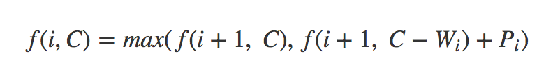 - $i$ তম আইটেম নেয়া, পরবর্তি সাবপ্রবলেম হবে $f(i+1, C – W_{i})$।