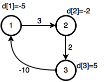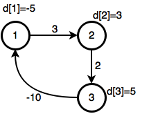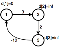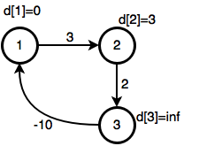 এখন নিচের মাত্র ৩নোডের গ্রাফটায় বেলম্যান ফোর্ড অ্যালগোরিদম চালাও, অর্থাৎ যতক্ষণ কোন নোড আপডেট করা যায় ততক্ষণ পুরো গ্রাফটা রিল্যাক্স কর: