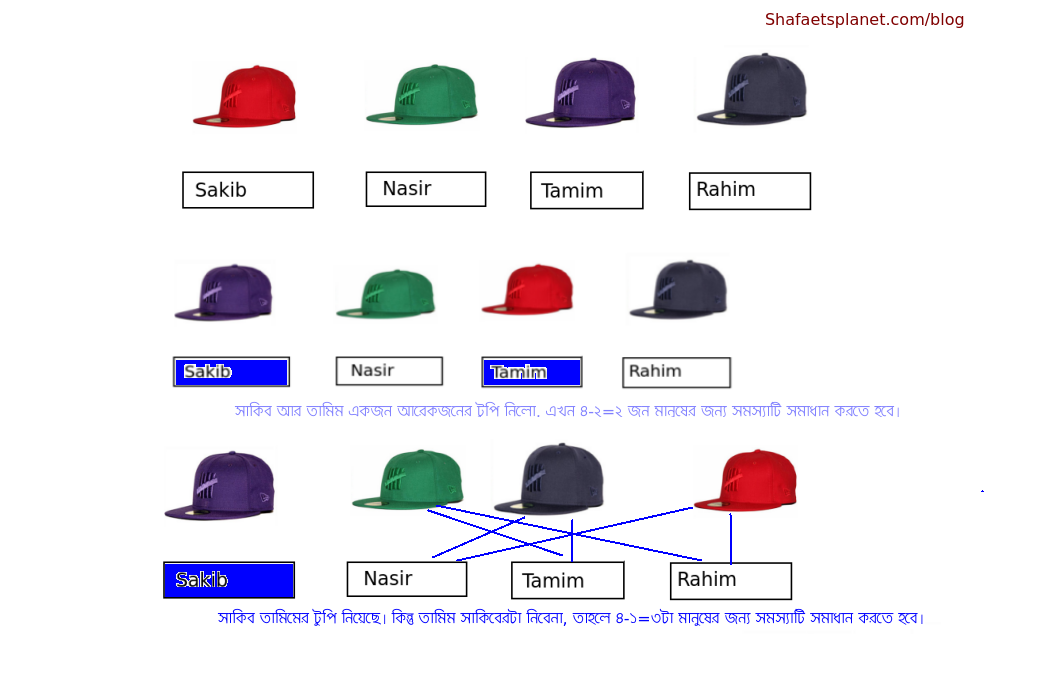 ২. পরের বার তামিম সাকিব ছাড়া অন্য কারো টুপি নিলো। এখন মানুষ বাকি ৪-১=৩ জন। তামিম যেহেতু সাকিবের টুপি নিচ্ছেনা তাই ওটাকেই তার নিষিদ্ধ টুপি ধরতে হবে, আর বাকি সবার কাছে নিষিদ্ধ টুপি হলো তার নিজের টুপিটা। তাহলে এখন ৪-১=৩ জন মানুষের জন্য ৪-১=৩ টা করে চয়েস আছে। লক্ষ্য করো